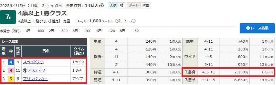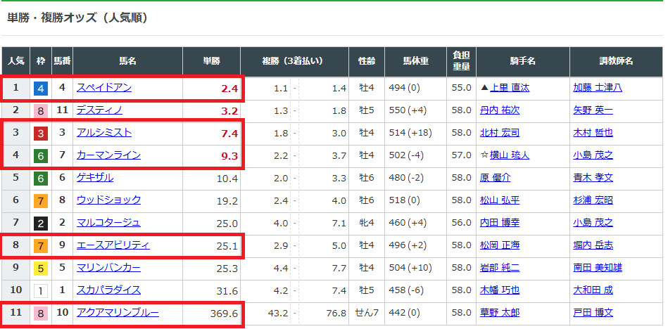 上位人気の中でも⑪デスティノは切っていたので1番人気の④しか買えていませんでした。