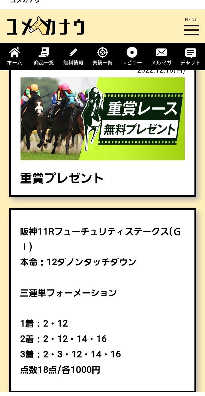 【ユメウマ】の朝日杯の予想でなくて【ユメカナウ】の無料予想2つ買ってれば107,300円になっていましたね(笑)