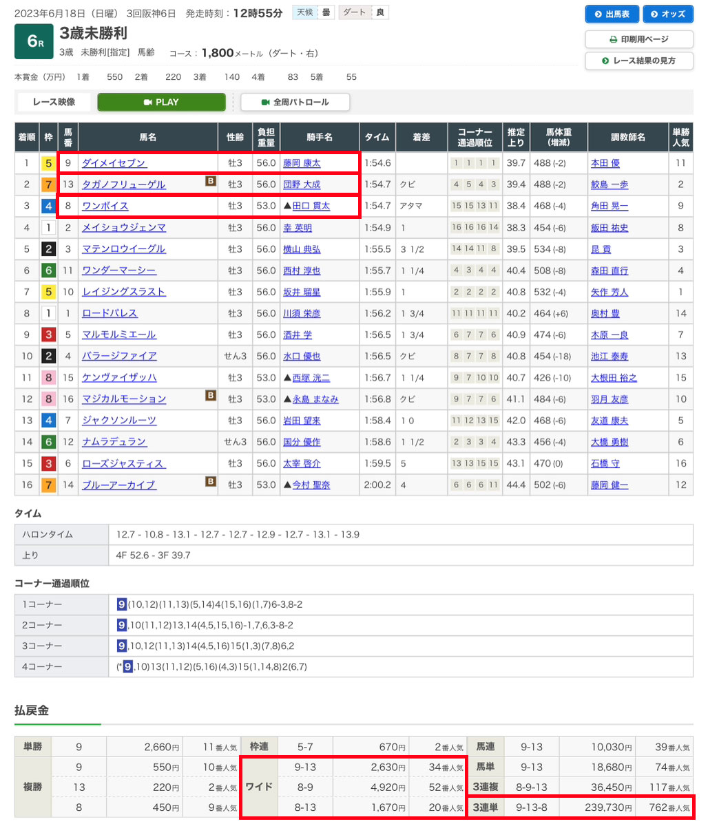 予想を見たからにはワイドの方が1点10,000円で30,000円分購入し、3連複の方が1点500円の18,000円分の合計48,000円分の馬券を購入しました。