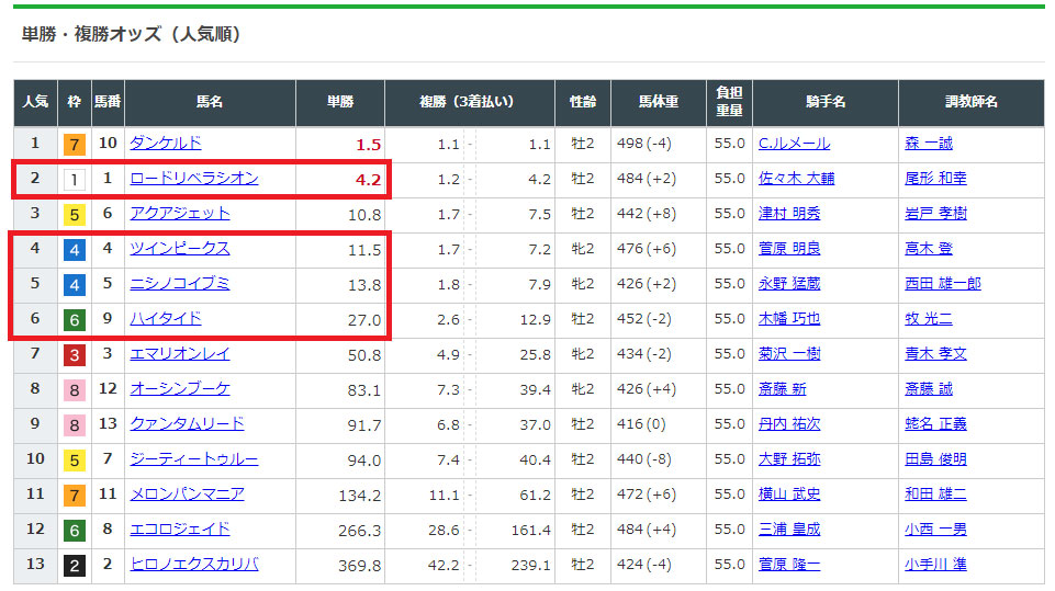 選んだ馬のオッズを見てみると、