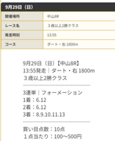 9月29日(日)に公開した買い目がこちらになります。