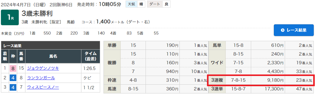 4万9100円(中山1R)+9万1800円(阪神1R)=合計14万900円獲得!