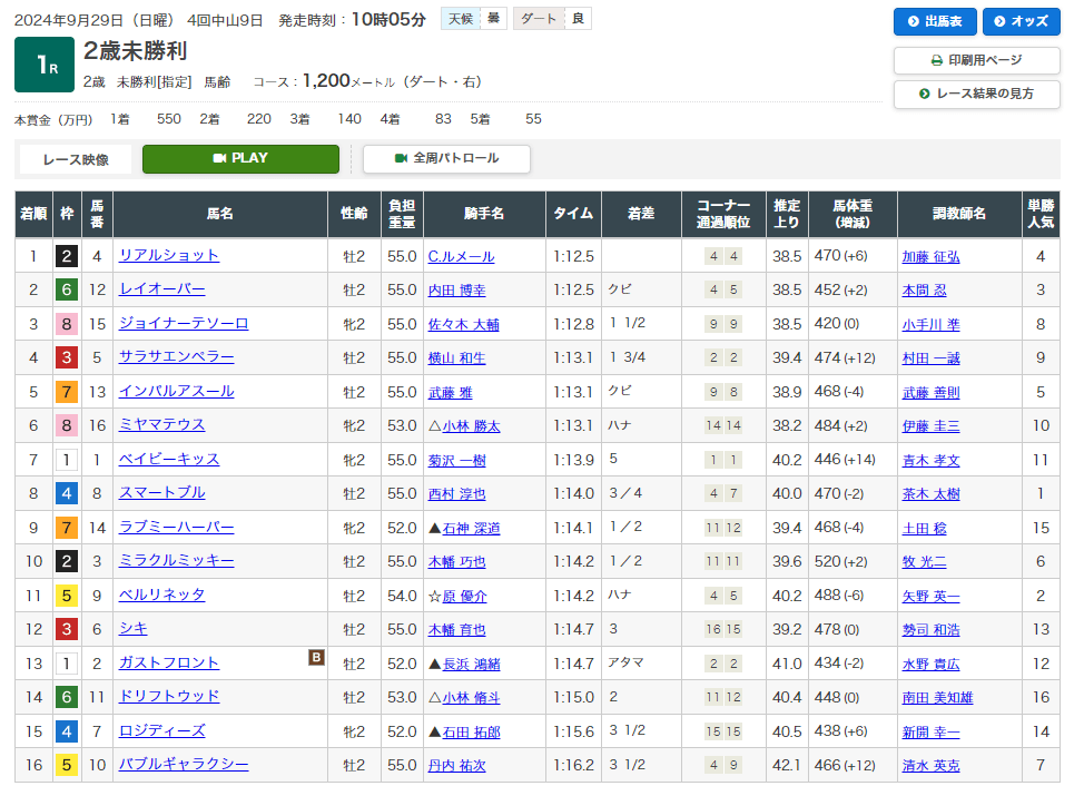 9月29日・中京5レース 2歳新馬 芝1400m