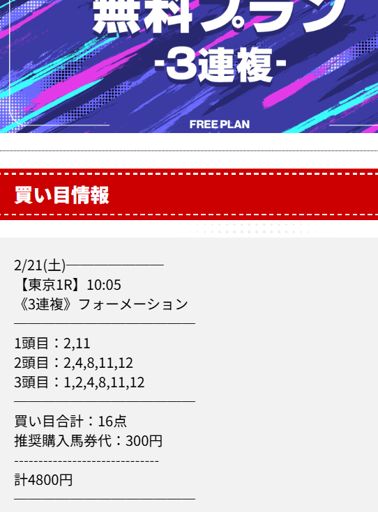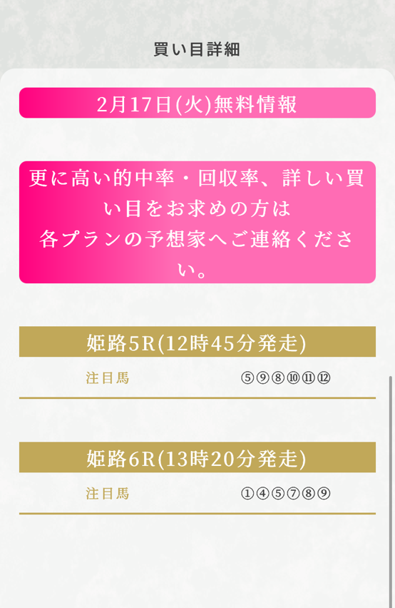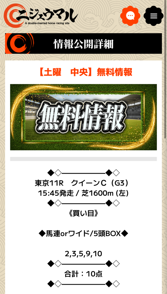 無料情報、こちらを紹介され始めてやってみました。 無料予想なのに精度の高い予想で当たりました。 これからも参考にさせていただきます。 サポートセンターに聞いたら平日は地方競馬の無料情報も出すという事なので期待です。