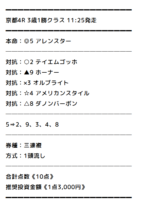 ニジュウマルの無料予想&有料予想ダブルで的中貰えました! 無料情報だが、何故7番人気と11番人気を拾ってるのにそれ以上に人気の2番人気外した?! まぁ、ここの無料予想は5点BOXが多いからその関係でだと思うけど、普通逆なんだけどな、某予想サイトは人気拾えるけど穴馬拾えないっていう。 その点、ニジュウマルは俺の中で及第点以上! 無料予想→5万1400円的中 有料予想→32万3400円的中 押さえで無料予想も参加してたから収支が有料情報に加算されてプラスになりました!