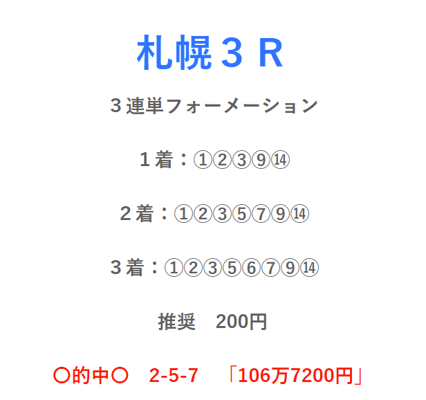 8/29の【勝ちうま常勝理論】の無料買い目情報に参加したんですが札幌3R3連単【2-5-7】払戻金533,600円 で100万円の帯封を簡単に掴めちゃいました。