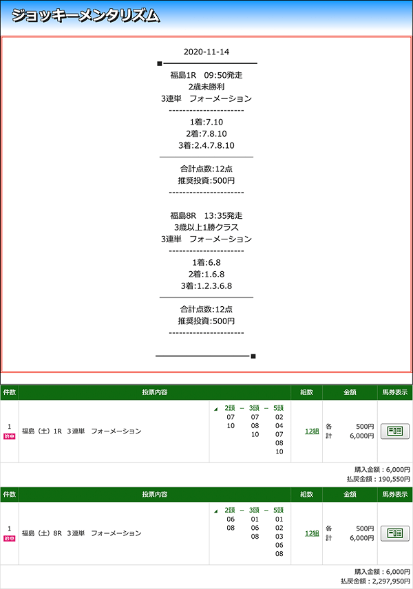1レース目が約20万の的中だったので続く福島8Rも同じ位の的中額かと思ったけどなんと10倍の200万円越えでびっくりしています!